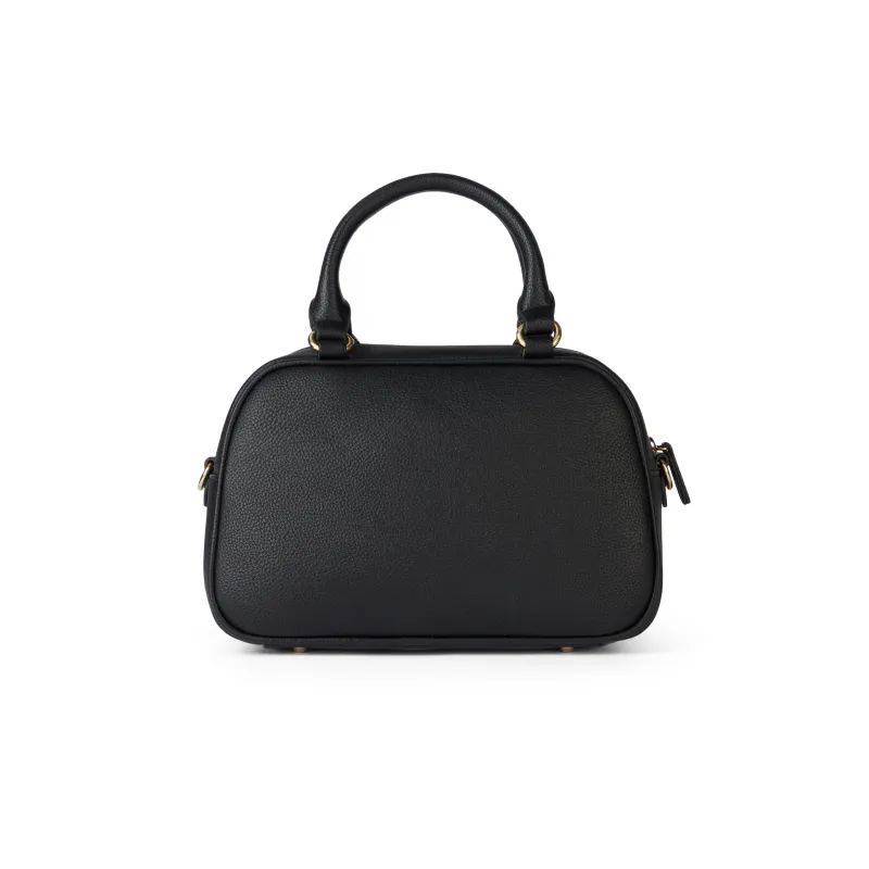 Borsa a bauletto della collezione Rock di Braccialini, con patch realizzati a ricamo e applicazioni in jais e paillettes arricchiti da una fitta cascata di micro borchiette dorate e da una maxi catena con ciondolo logato a forma di cuore.