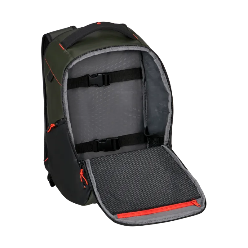 Zaino piccolo della collezione Ecodiver di Samsonite, dotato di due comparti con chiusura con zip, di cui il principale adatto per inserirvi indumenti mentre il posteriore per riporvi un pc da 14" e un tablet.
