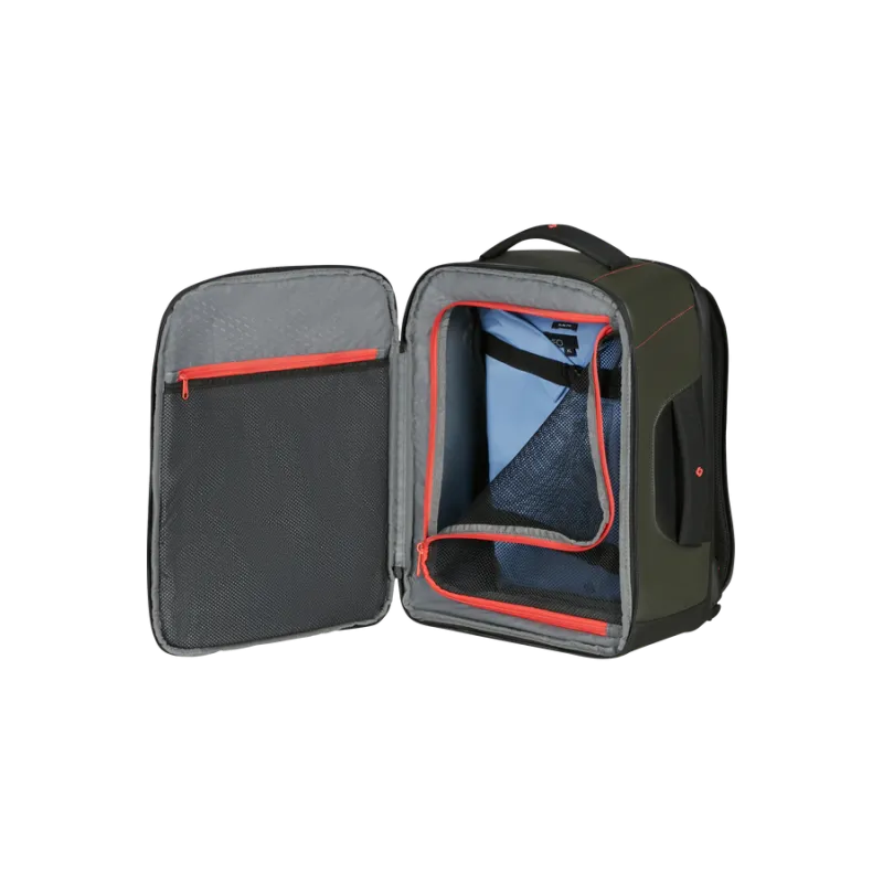Zaino da viaggio misura S della collezione Ecodiver di Samsonite, dotato di due comparti, il principale per indumenti, il posteriore per computer e tablet, lo schienale è traspirante, gli spallacci imbottiti e regolabili.