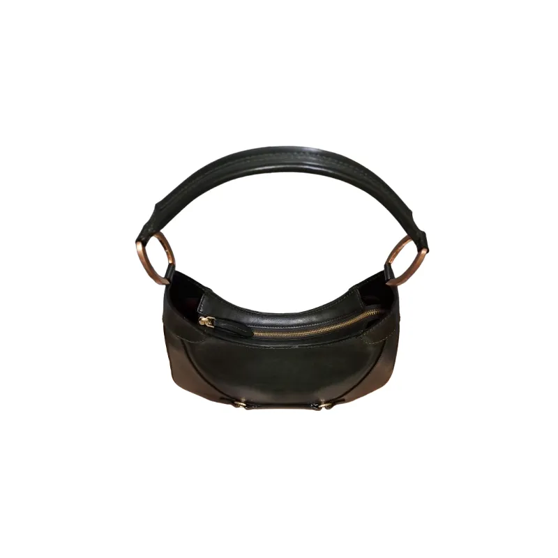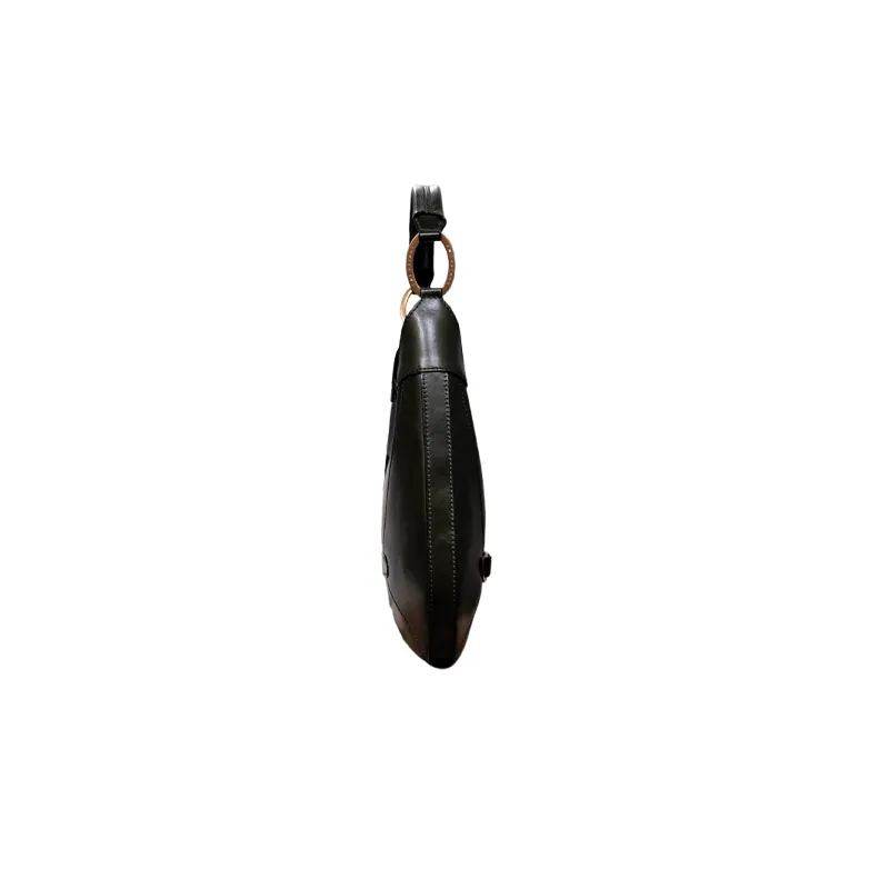 Realizzata secondo la tradizione artigianale italiana, presenta dettagli unici come i fianchi con doppia patta simmetrica, uniti da una staffa centrale con anelli metallici, e un manico curvo strutturato fissato con eleganti anelli decorativi. Ogni elemento richiama il mondo della selleria di lusso, esaltando la qualità dei materiali e l’eccellenza della lavorazione.