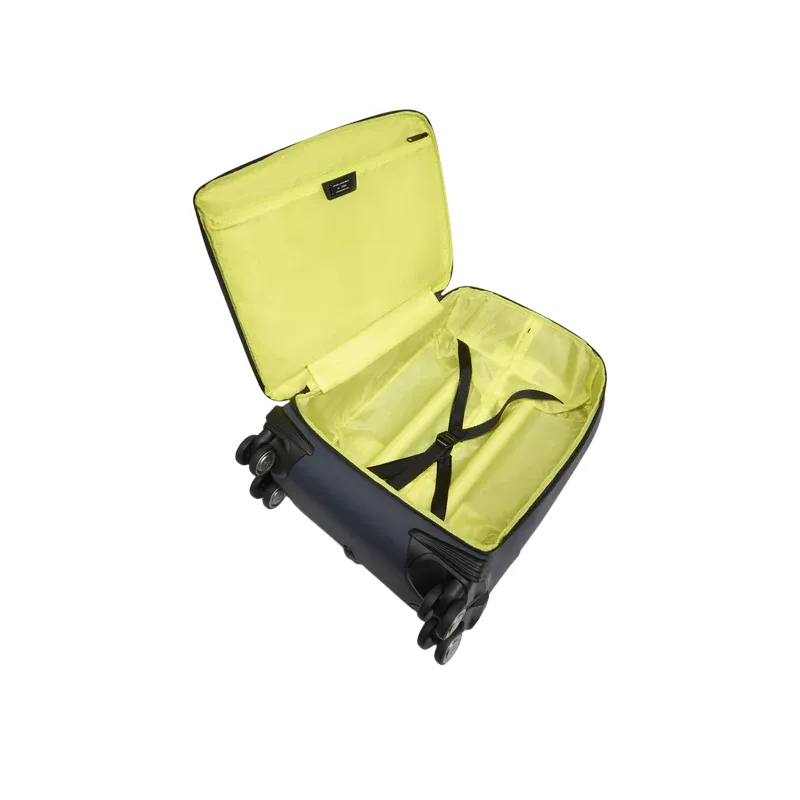 Trolley cabina a 4 ruote della collezione C2OW di Piquadro, realizzato in tessuto gommato resistente all'acqua con protezione antiurto, dotato di chiusura con zip, traino con carrello bi-tubo e quattro ruote.