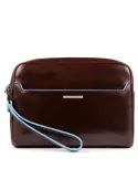 Pochette porta iPad®mini della collezione Blue Square di Piquadro, realizzata in pelle naturale, dotata di apertura con cerniera, manico removibile, tasca esterna con cerniera per oggetti di prima necessità.