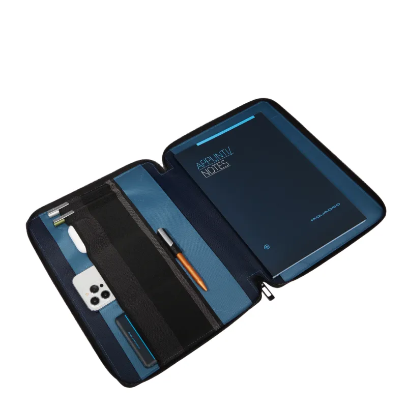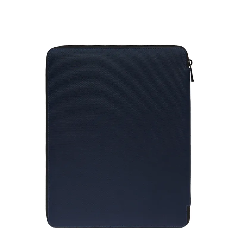 Portablocco con scomparto per iPad®Pro 12,9” della collezione Wollem di Piquadro, realizzato in tessuto con dettagli in pelle, internamente porta penne e tasca per AirPods.