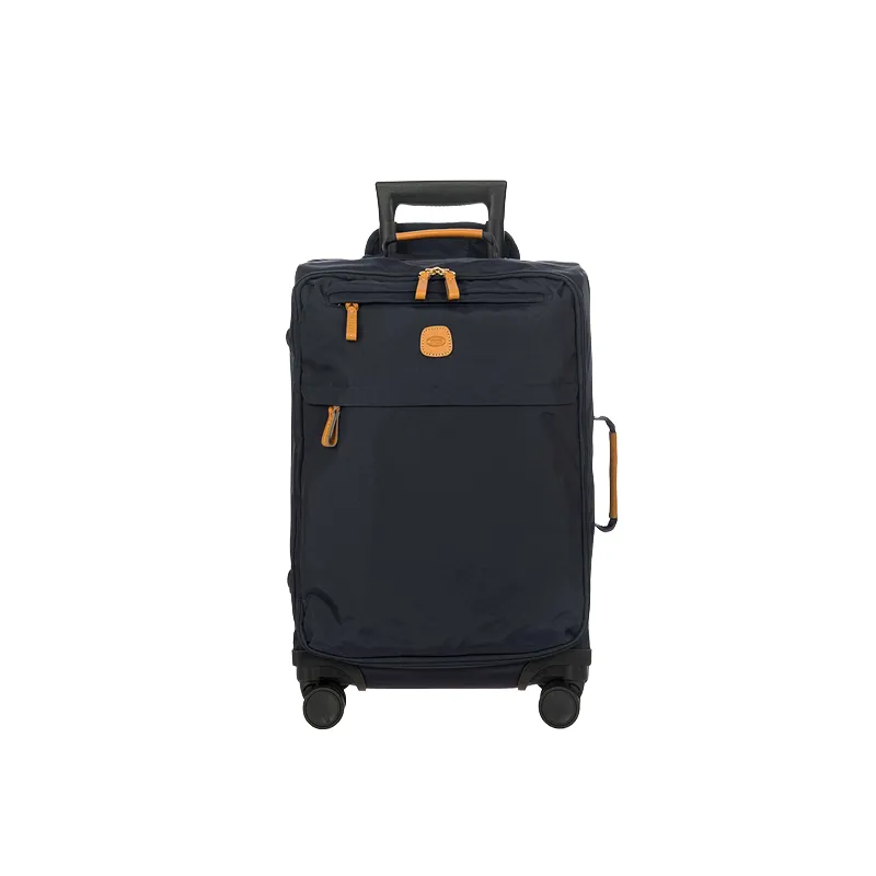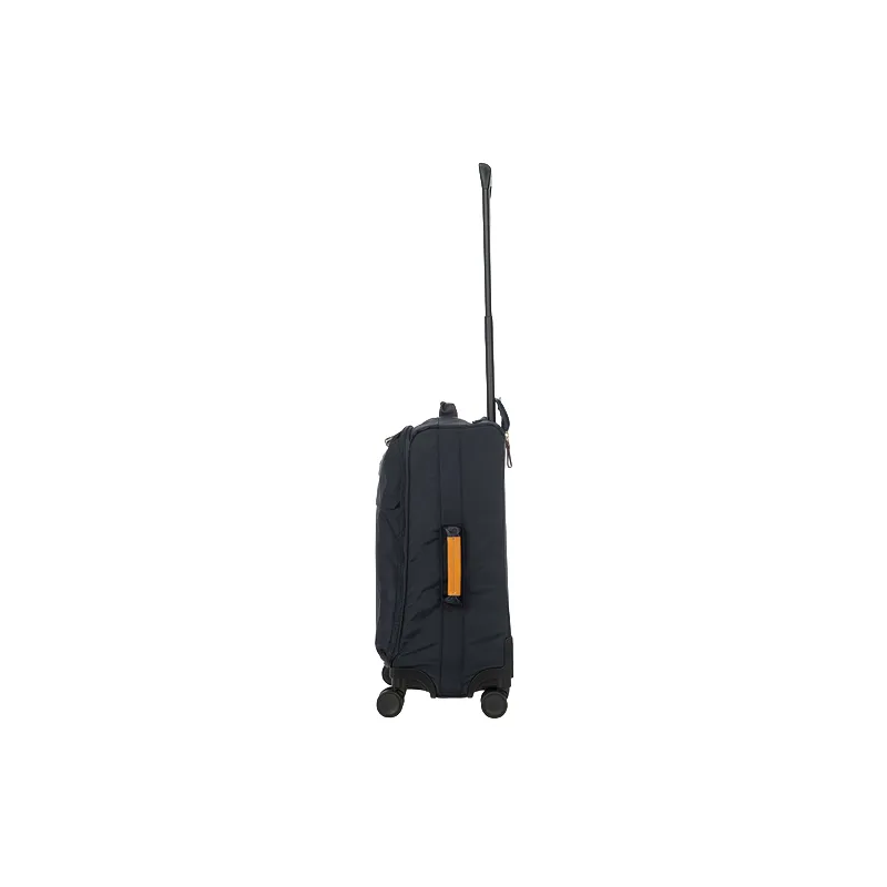 Trolley cabina della linea Brics X-Travel, realizzato in resistente, leggero ed impermeabile tessuto con finiture in pelle naturale, dotato di ampio scomparto con apertura con cerniera, internamente cinghie ferma abiti e tasca con cerniera, tasche esterne con cerniera per oggetti o indumenti di prima neccessità, traino quattro ruote, manico laterale e superiore.