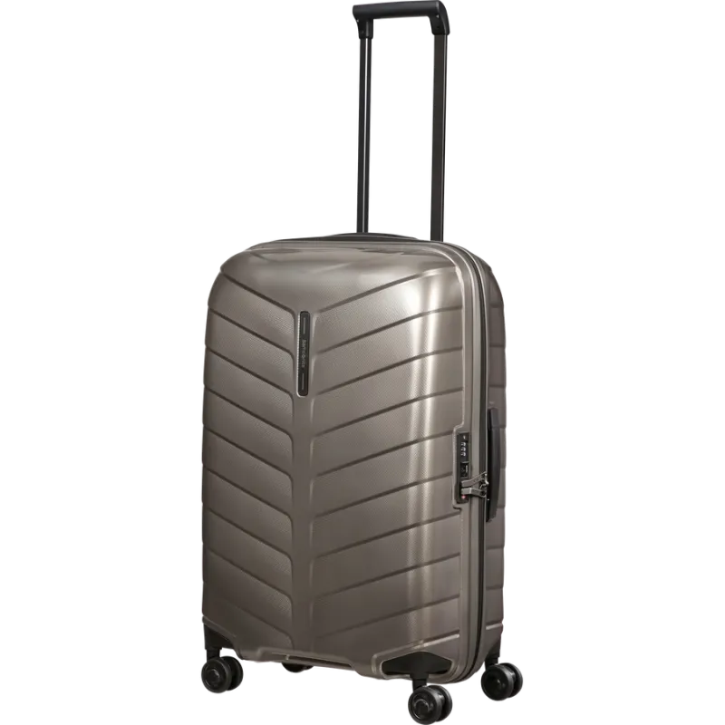 Trolley medio della collezione Attrix di Samsonite, dotato di traino con carrello bitubo a 4 ruote, chiusura con combinazione e TSA, manico superiore e laterale.