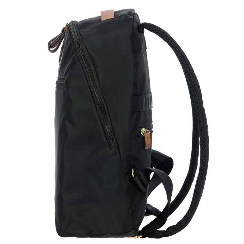 Zaino di misura media della X-Collection di Brics, realizzato in nylon riciclato, leggero e resistente con finiture in pelle. Dotato di spallacci regolabili in lunghezza lo rendono comodo da indossare e con la piccola maniglia superiore in pelle è portabile anche a mano. Dotato di tasche interne di cui una con zip. Esternamente è dotato di una tasca con zip sul fronte e di una tasca con zip sul retro ideale per contenere gli oggetti più preziosi. L'apertura principale è dotata di zip . Sul retro è presente una fascia per il fissaggio sulla maniglia del trolley.