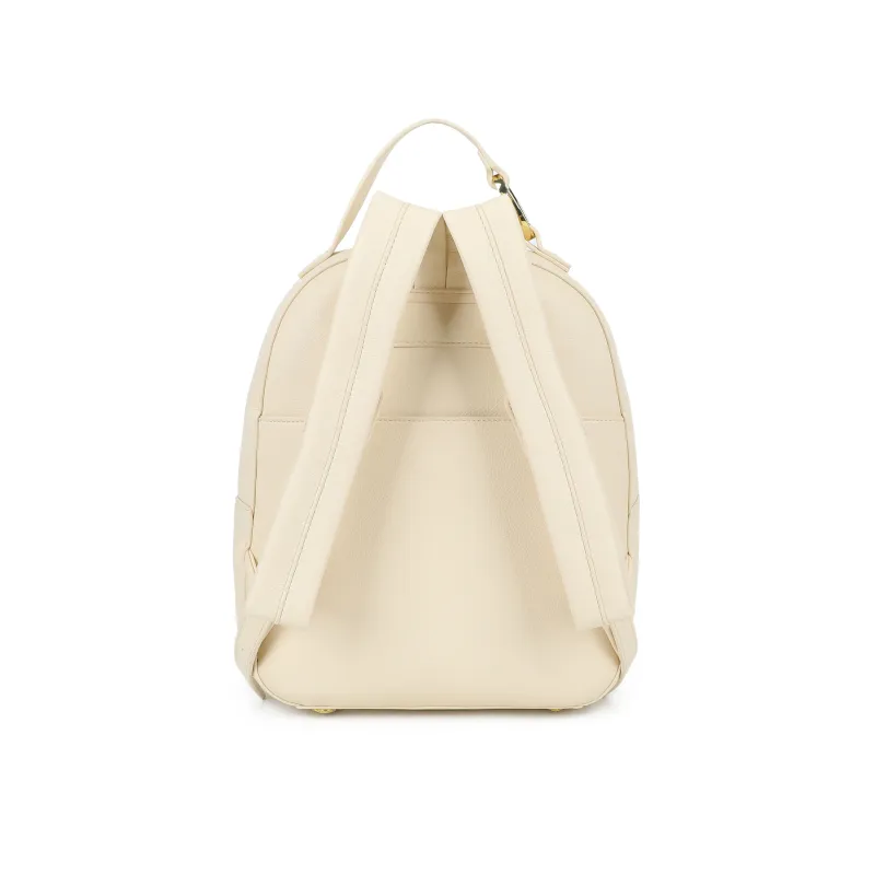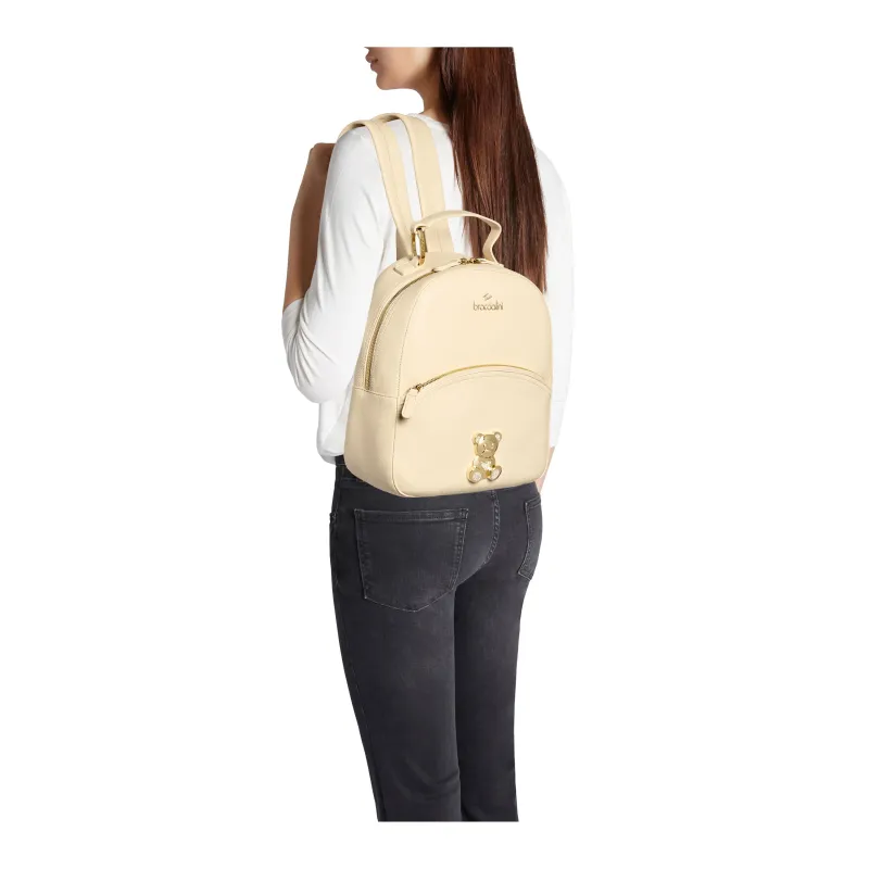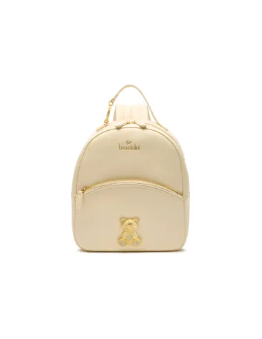 Lo zaino della collezione Amy Bijoux di Braccialini combina praticità e stile in un design sofisticato, moderno e luminoso. Realizzato in ecopelle di alta qualità, presenta una linea minimalista ed elegante, arricchita da un dettaglio distintivo: un orsetto dorato decorato con applicazioni scintillanti, che impreziosisce la tasca frontale con zip, donando luce e raffinatezza al design.