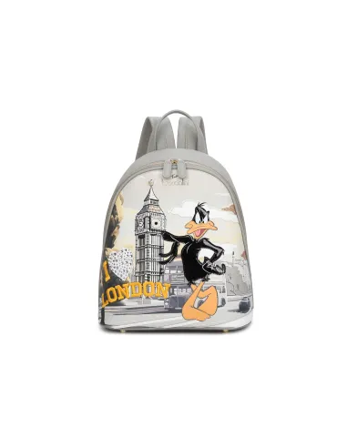 Realizzato in ecopelle di alta qualità, è decorato con una stampa ispirata a Londra, dove spiccano l’iconico Big Ben e una divertente applicazione di Daffy Duck in primo piano.