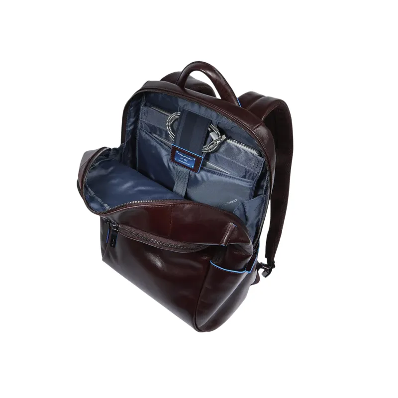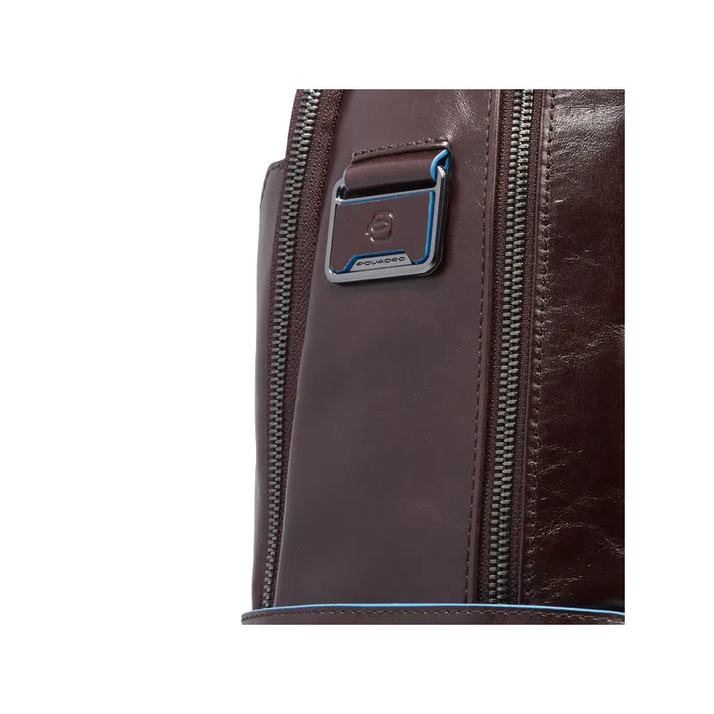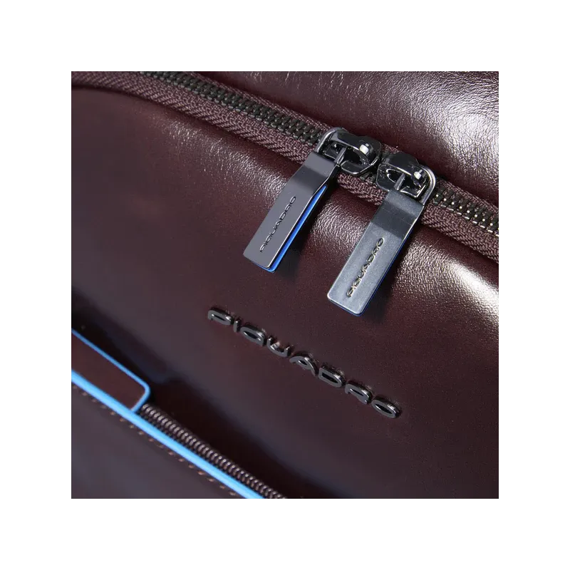 Zaino grande con protezione anti-frode RFID della collezione Blue Square di Piquadro, dotato di doppio scomparto con zip, di cui uno organizzato con vano imbottito porta notebook e porta ipad, passante posteriore per aggancio al trolley, tasca esterna porta bottiglia ripieghevole, spallacci imbottiti e regolabili.