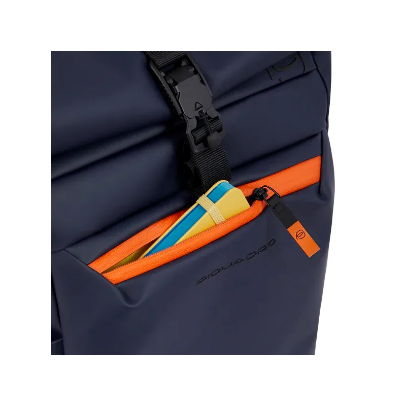 Zaino Roll-Top della collezione Piquadro, realizzato in resistente ed impermeabile tessuto gommato, dotato di unico comparto con tasca imbottita per computer e Ipad, sistema di aggancio al trolley con passante, tasche laterali porta bottiglia/ombrello, spallacci imbottiti e regolabili, schienale traspirante.
