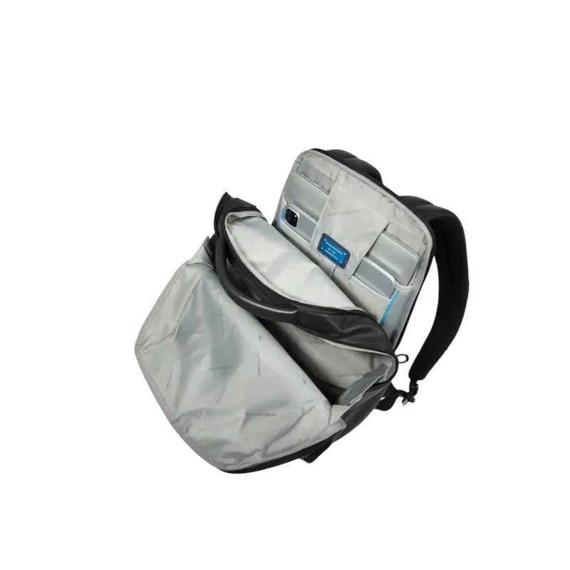 Il comparto posteriore è pensato per contenere in totale sicurezza un notebook da 14" grazie al sistema Shock Absorber, oltre a uno scomparto fisso per iPad® 10,2”, Air 10,9” e Pro 11". Il comparto principale, invece, si apre completamente per permettere l’inserimento di capi d’abbigliamento, rendendo questo zaino ideale anche per viaggi brevi o trasferte di lavoro.